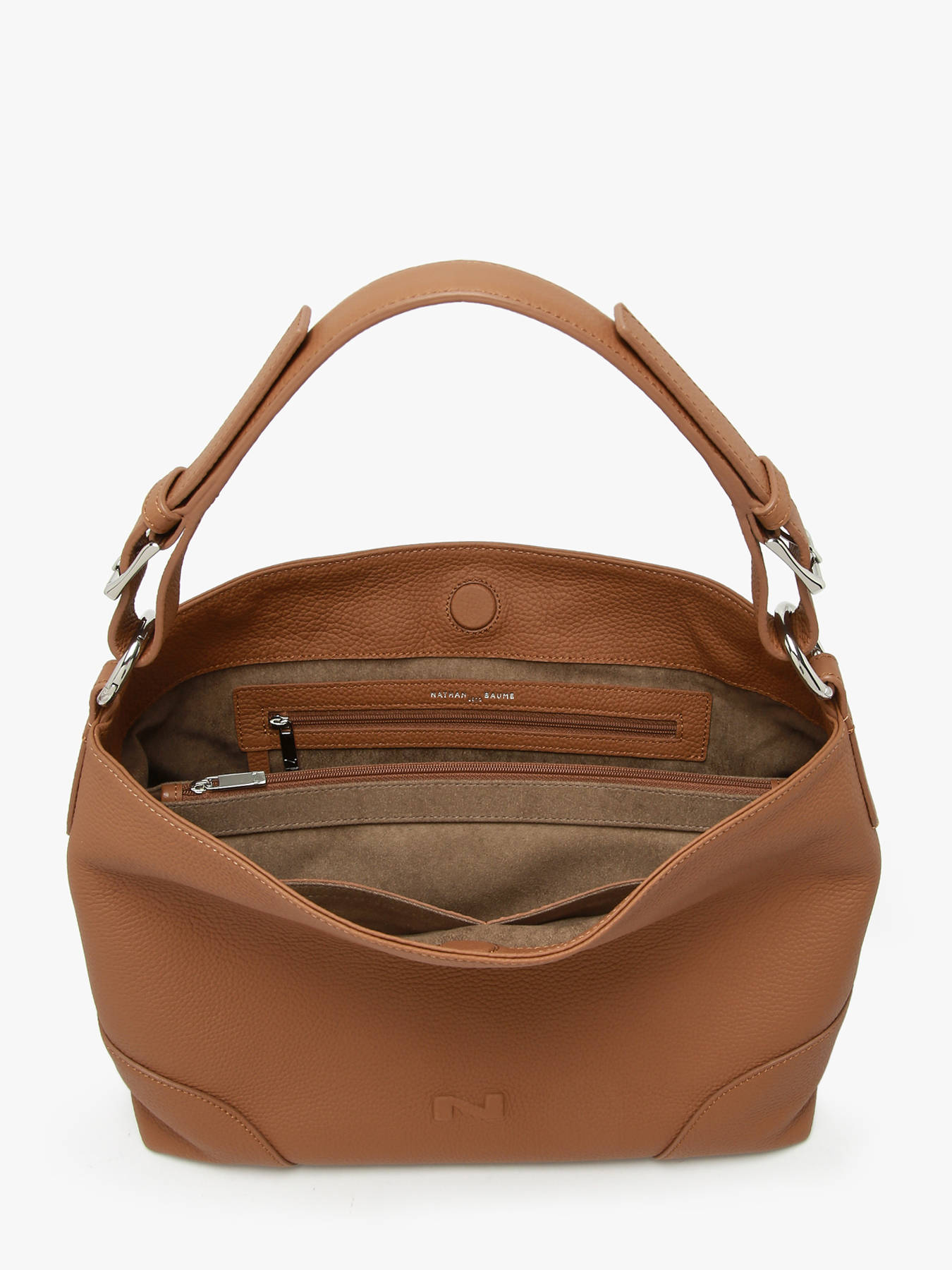 Ontdek dit nieuwe praktische model van het kwalitatieve Belgische merk Nathan baume. Dit Tango bis  model is gemaakt van volledig generfd leder. De binnenkant van deze handtas is afgewerkt in suède. Zoals elke handtas van Nathan baume werd deze aan de voorzijde afgewerkt met het iconische Nathan baume logo. Deze schoudertas is dus super elegant en daarbovenop ook nog eens praktisch door zijn handige indeling.  De handtas is namelijk voorzien van een scheiding met een ritssluiting. Hierdoor heeft de tas twee compartimenten waardoor je makkelijk je spullen kunt ordenen. Ook het zijvak met ritssluiting en de twee enkele steekvakken, waaronder een gsm-vak zorgen voor een geordende tas. Door zijn ruime indeling en sobere look zal deze tas je dagelijkse must-have zijn.