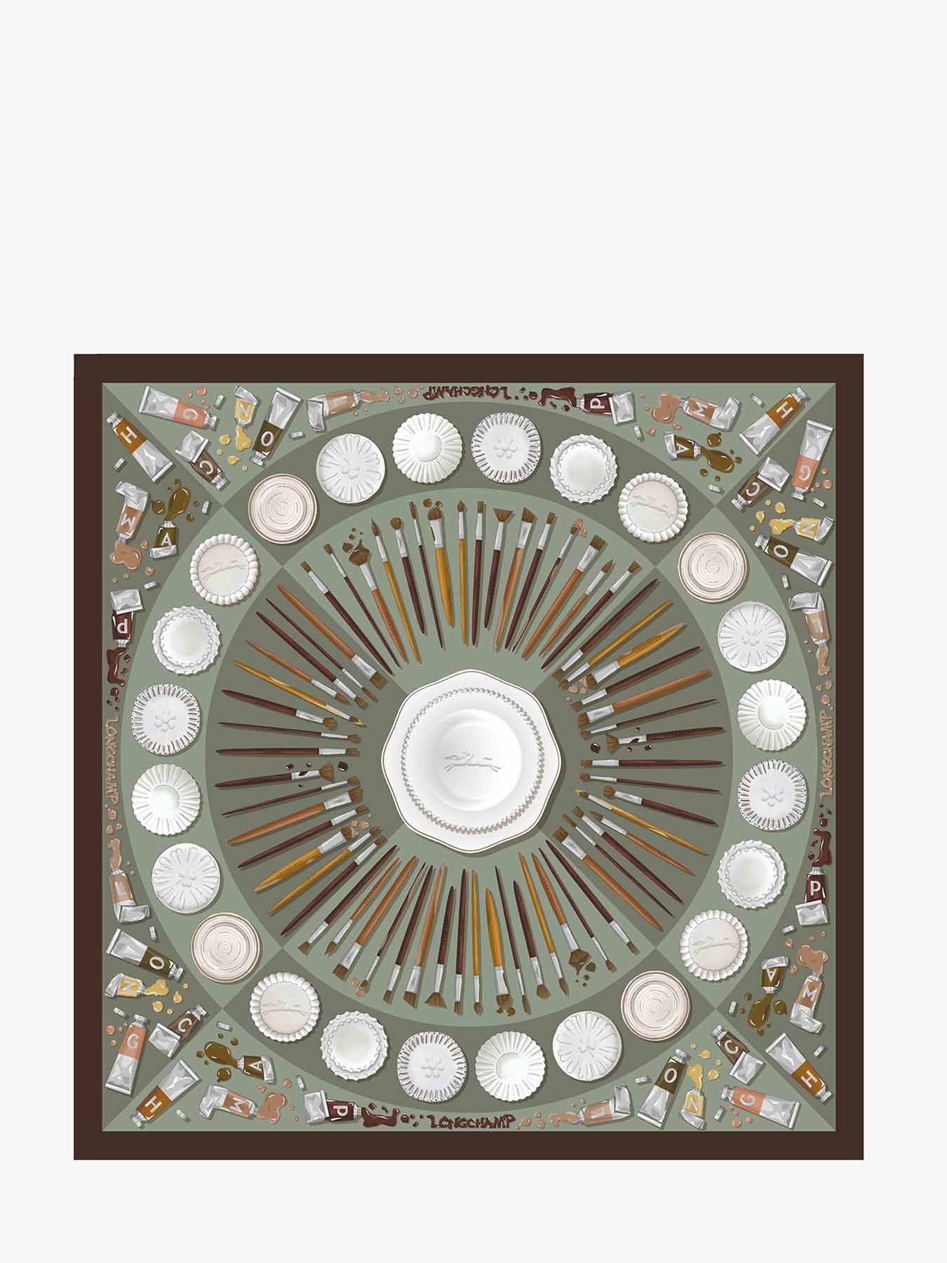 De zijden sjaal 70x70 cm « Palette d’Artiste » van Longchamp belichaamt de essentie van artistieke creatie. Geïnspireerd door de kleurrijke wereld van de keramist, toont deze sjaal de rijkdom van levendige tinten en de fijnheid van details, zoals porseleinen borden met gegolfde randen, symbolen van de Franse levenskunst. Gemaakt van uitzonderlijke zijde, weerspiegelt dit iconische accessoire het unieke vakmanschap van het huis Longchamp. Veelzijdig te dragen, stijlvol om de hals, als haaraccessoire of zelfs geknoopt in de taille, om je silhouet te verfraaien en te personaliseren met een verfijnde toets.